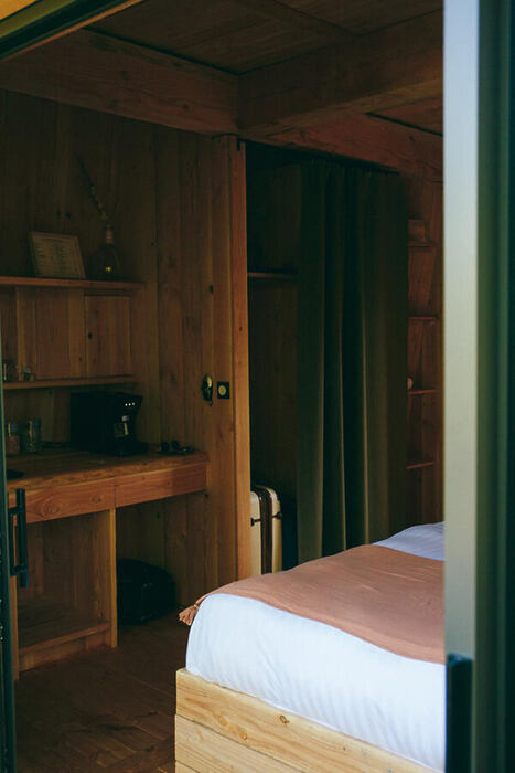 Das verwendete Holz stammt aus der Region – Douglasie, geschlagen in der Nähe und verarbeitet von einem lokalen Handwerksbetrieb. Die einzelnen Module, inklusive Möbel und Einbauten, wurden vorgefertigt und vor Ort zusammengefügt. So entstand ein harmonisches Gesamtbild aus modernem Design und naturverbundener Bauweise.