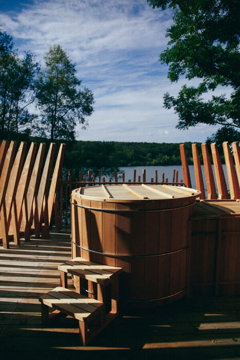 Diese eleganten Rückzugsorte, die jeweils für zwei Personen ausgelegt sind, wurden auf Stelzen errichtet und wirken wie eine Mischung aus Baumhaus und Designobjekt. Ihre spiralförmige Architektur erinnert an eine sich öffnende Knospe – ein Gefühl von Geborgenheit, ohne die Natur auszuschließen. Das Herzstück befindet sich im zweiten Stock: ein helles Schlafzimmer mit großen Fenstern, durch die sich die frische Waldluft zieht. Ganz oben, auf dem Dach, erwartet dich ein skandinavisches Badefass mit spektakulärem Blick über Baumwipfel und Landschaft.